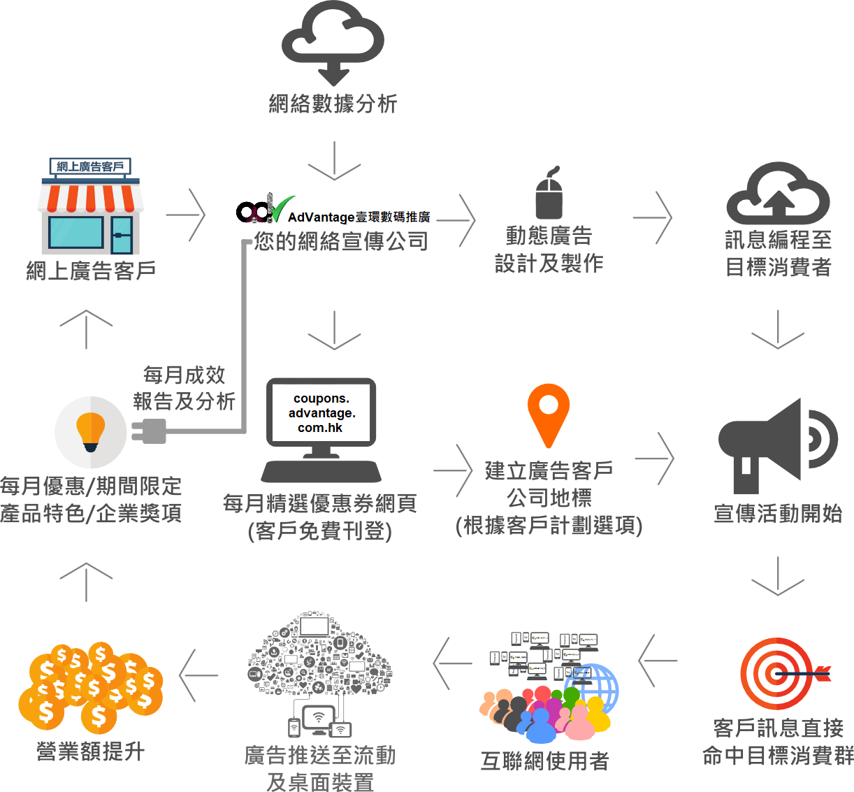採用AdVantage壹環數碼每月之產品與服務優惠推廣, 是 貴公司提升每月銷售額的重要一環. 透過網絡宣傳能有效地將相關訊息帶給目標客戶, 並使相關廣告能繼續顯示於互聯網用家之電腦及手提裝置平台上.